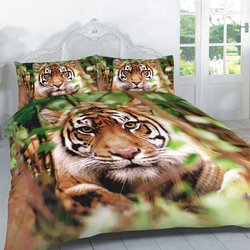 The eye-catching Tiger 3D photographic print duvet cover set is guaranteed to be a striking addition to your room.Featuring a stunning photographic design, this duvet cover set is made from a premium cotton-polyester blend, ensuring both comfort and durability.